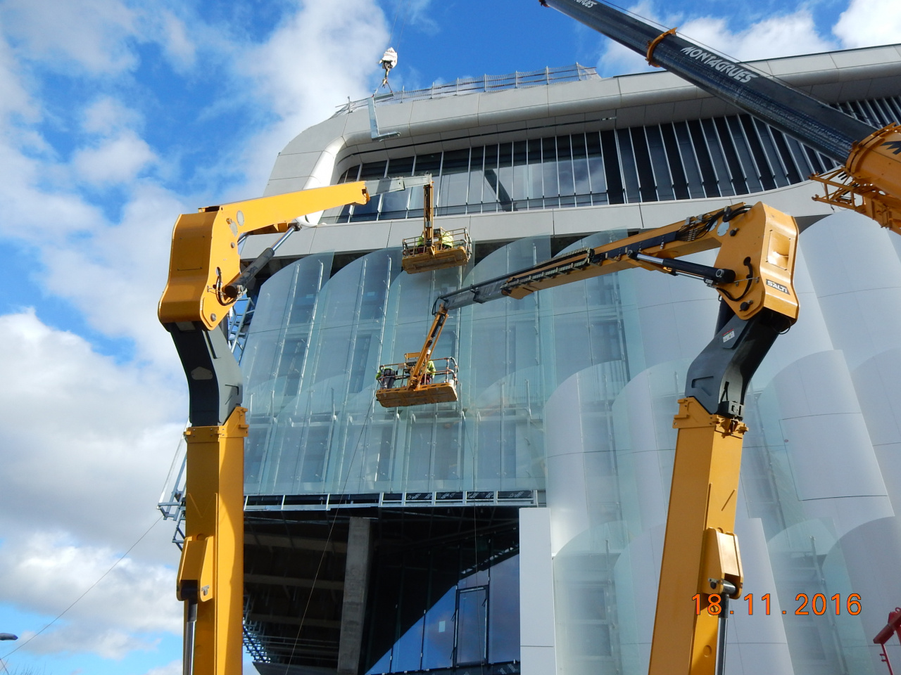 Poslední kusy prosklených shellů byly osazeny na fasády administrativních prostor v severní části budovy rugbyového stadionu, a tím byla montáž definitivně ukončena.