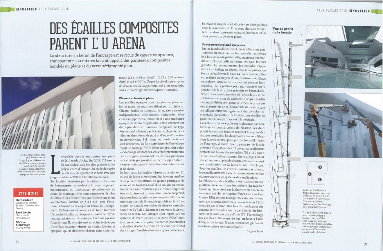 Závěrem každého roku časopis také rekapituluje projekty, které v důsledku požadavků francouzské legislativy musely podstoupit náročný certifikační proces ATEx. Titulním projektem se v loňském prosincovém čísle stala Arena Nanterre, na které Sipral pracuje od roku 2014. Certifikace nestandardního technického řešení spočívala v úzké spolupráci se stavebním vědecko-technickým institutem CSTB a v realizaci řady nestandardních testů a zkoušek pod dohledem francouzského Technického kontrolního úřadu. Více podrobností naleznete již brzy v překladu celého publikovaného článku.