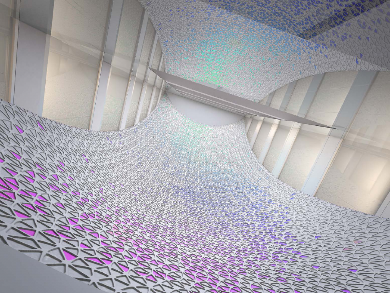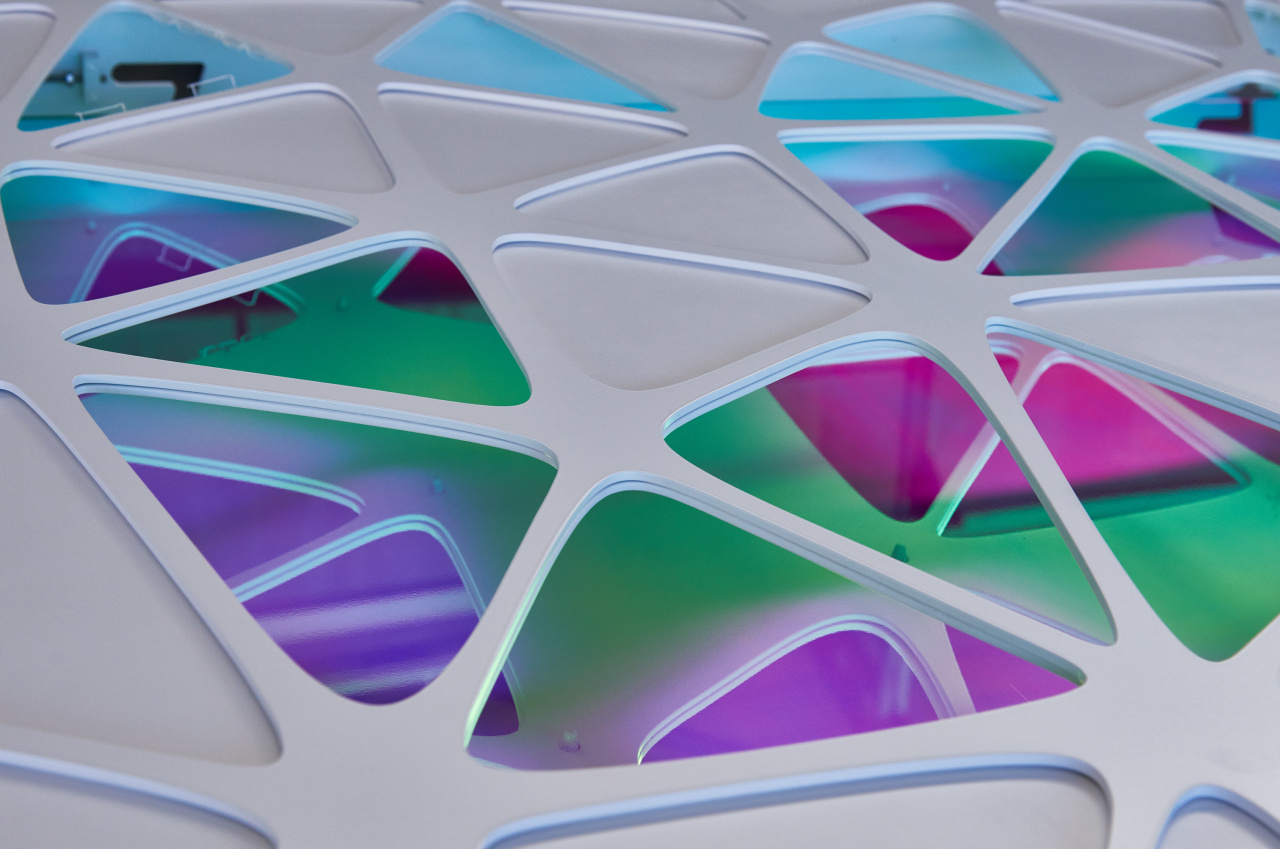 The very first design was inspired by the original aspect of roof stained glass and its basic flower pattern. The whole structure is composed of dozens of inter-connected although individually dismountable panels made of two basic layers installed on an aluminium bearing structure.