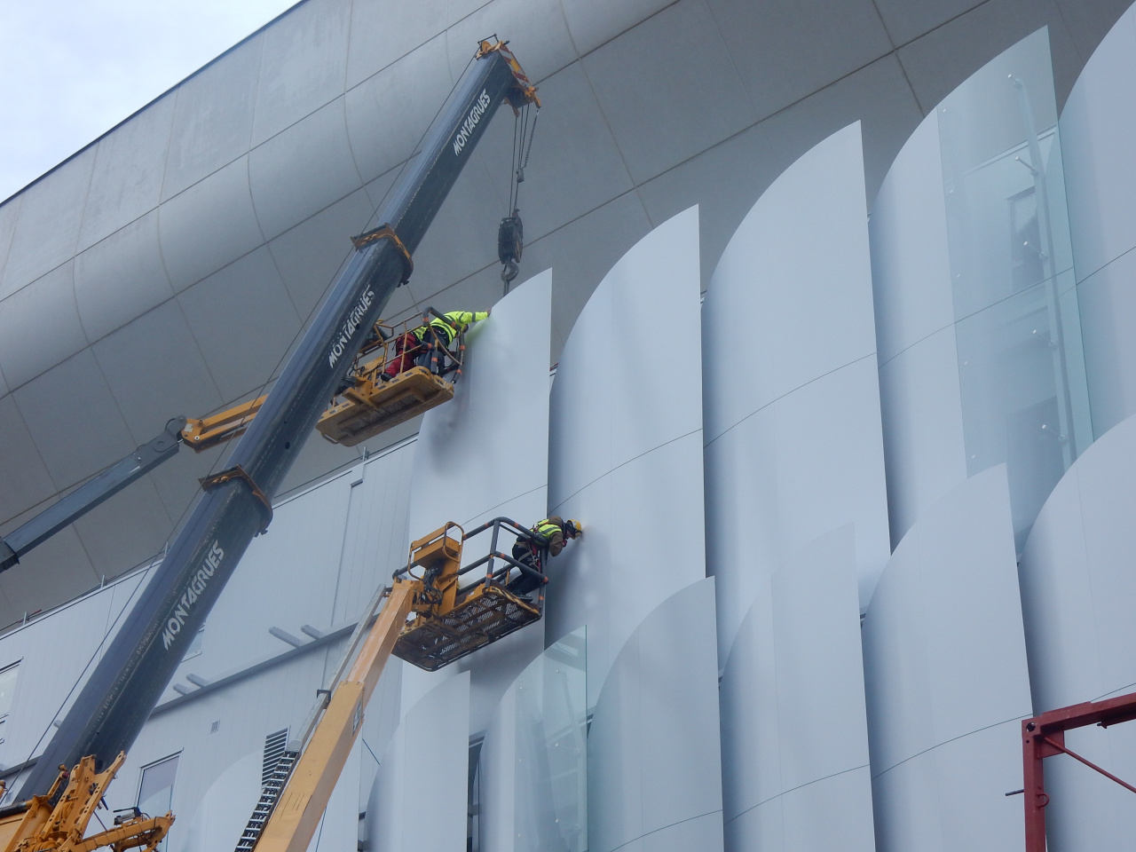 On the western facade of Arena 92, boulevard des Bouvets, Nanterre, there are the first of 600 scales installed. The building with an impressive silhouette highlighted with a white roof edge is situated westwards from Grande Arche on La Défense.