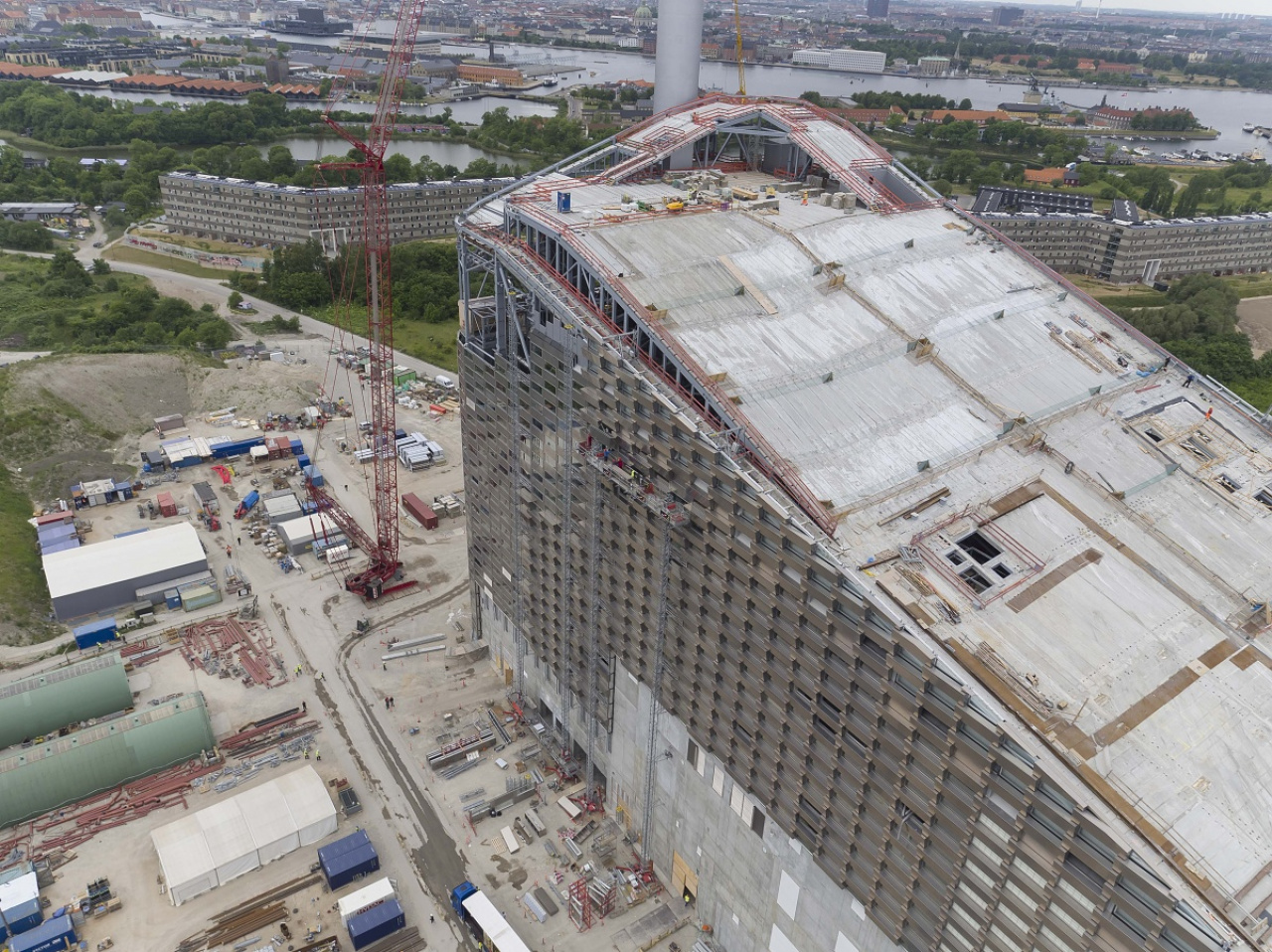 Mast climbers played an important role in the Amager Bakke façade work. Amager Bakke is a state-of-the-art waste to energy plant, one of the best in the world in terms of efficiency and environmental impact. The plant is equipped with two furnace lines and a joint turbine and generator system. A special feature is a ski slope on top of the plant.