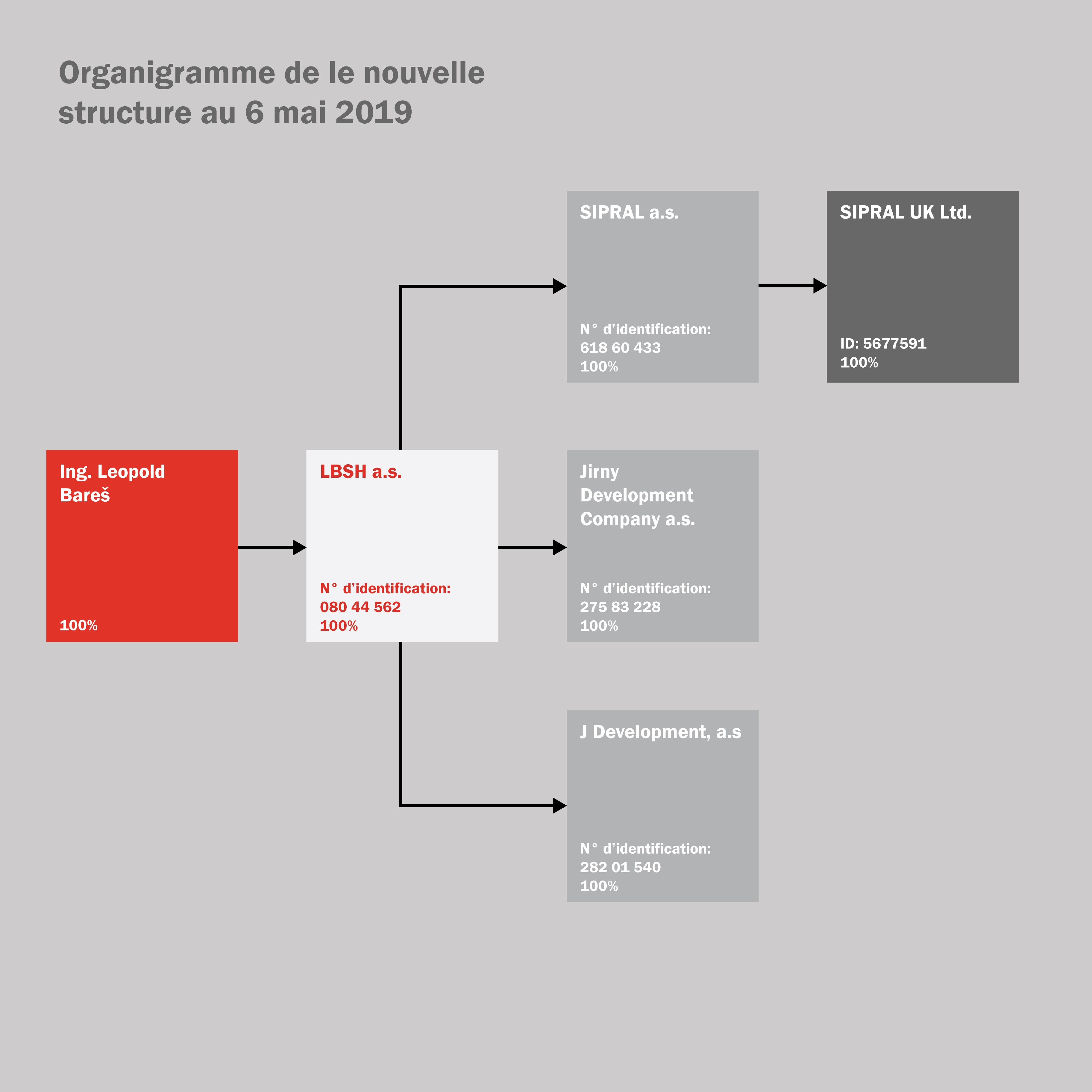 Dans ce cadre, LBSH a.s., ,absorbera 100% de SIPRAL a.s. le 6 mai 2019, M. Leopold Bareš personne physique, en était l‘actionnaire majoritaire (100%) à l‘origine. Avant la création de la holding, il possédait, en plus de la société SIPRAL a.s., SIPRAL UK Ltd. la société Jirny Development Company a.s. ainsi que J Development, a.s. Ces sociétés sont désormais transférées au sein de société LBSH.